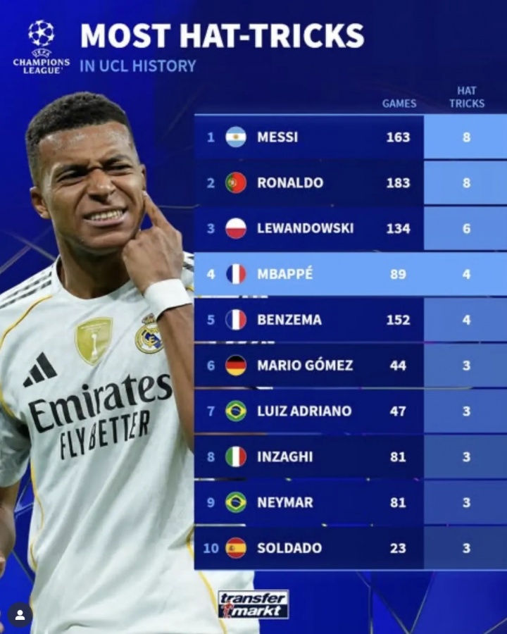 Trong vòng Champions League này, Real Madrid đã đánh bại Almaty Keirat 5-0 và MBappe đã ghi bàn hat-trick. Sau đây là số lượng hat-trick trong lịch sử Champions League: